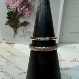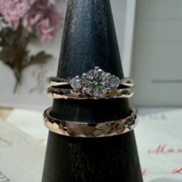 K18コーラルゴールドの優しい雰囲気をお揃いにした結婚指輪。男性用は手仕事の温かみのある槌目(つちめ)のテクスチャーを光沢ありとホーニング(光沢なし)で半面づつ。女性用は2㎜幅と華奢なお指に合う優し気な甲丸に、光沢のきれいな鏡面に三つのグランバーガーメレダイヤモンドを合わせて。半面は柔らかく光を反射する槌目をお選びいただきました。テクスチャーの複数選択は、正面を変えることで気分やシーンに合わせて使い分けが可能です。