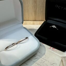 プラチナの華やかな光沢と煌めくダイヤモンドの婚約指輪は、王道ながら着けると気持ちが上がるデザインの美しさです。重ね付けの際には、結婚指輪の二種のテクスチャーのどちらの面を正面にするかで、違った雰囲気が楽しめます。