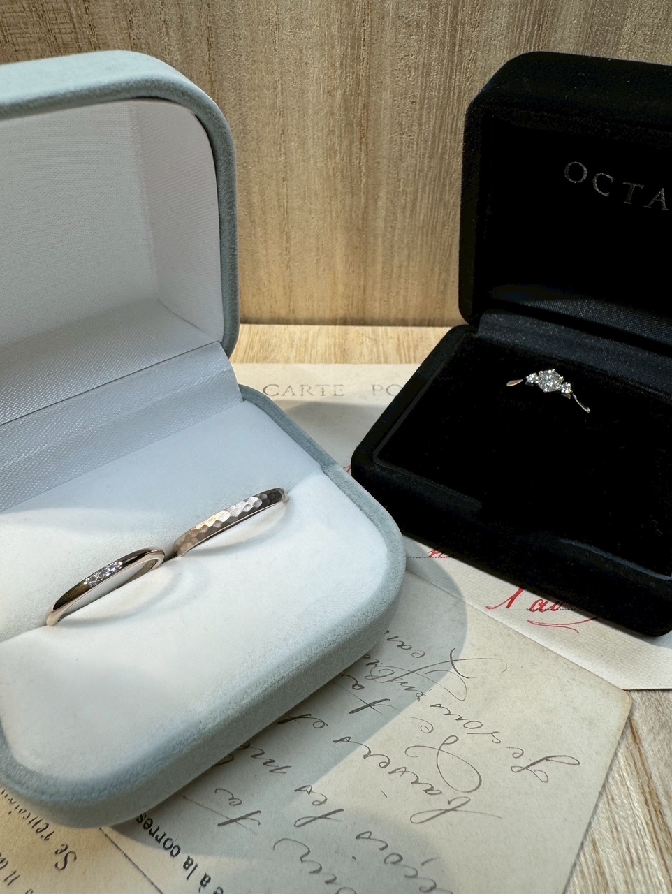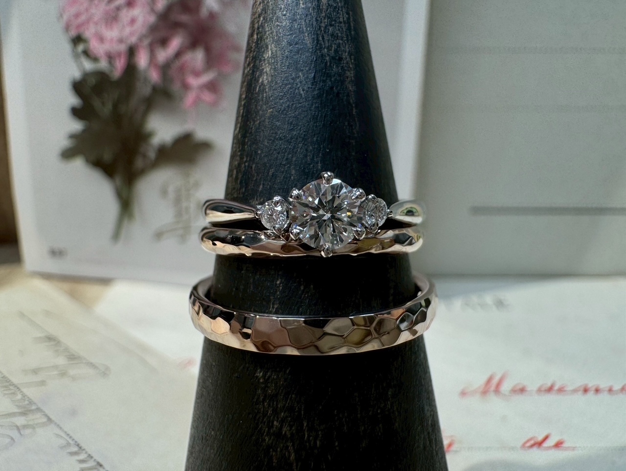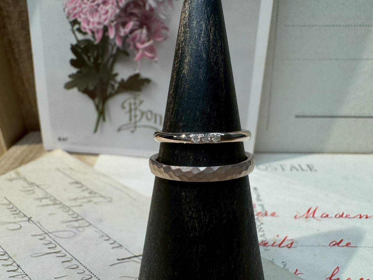 K18コーラルゴールドの優しい雰囲気をお揃いにした結婚指輪。男性用は手仕事の温かみのある槌目(つちめ)のテクスチャーを光沢ありとホーニング(光沢なし)で半面づつ。女性用は2㎜幅と華奢なお指に合う優し気な甲丸に、光沢のきれいな鏡面に三つのグランバーガーメレダイヤモンドを合わせて。半面は柔らかく光を反射する槌目をお選びいただきました。テクスチャーの複数選択は、正面を変えることで気分やシーンに合わせて使い分けが可能です。