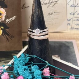 婚約指輪のpupilは、純粋な輝きを放つPt950(プラチナ950)でお作りしました。温かみのある結婚指輪のK18コーラルゴールドのお色との相性も良く、それぞれのグランバーガーダイヤモンドの輝きがお互いを引き立てあい、まるで小さな花束のようなきらめきが生まれます。